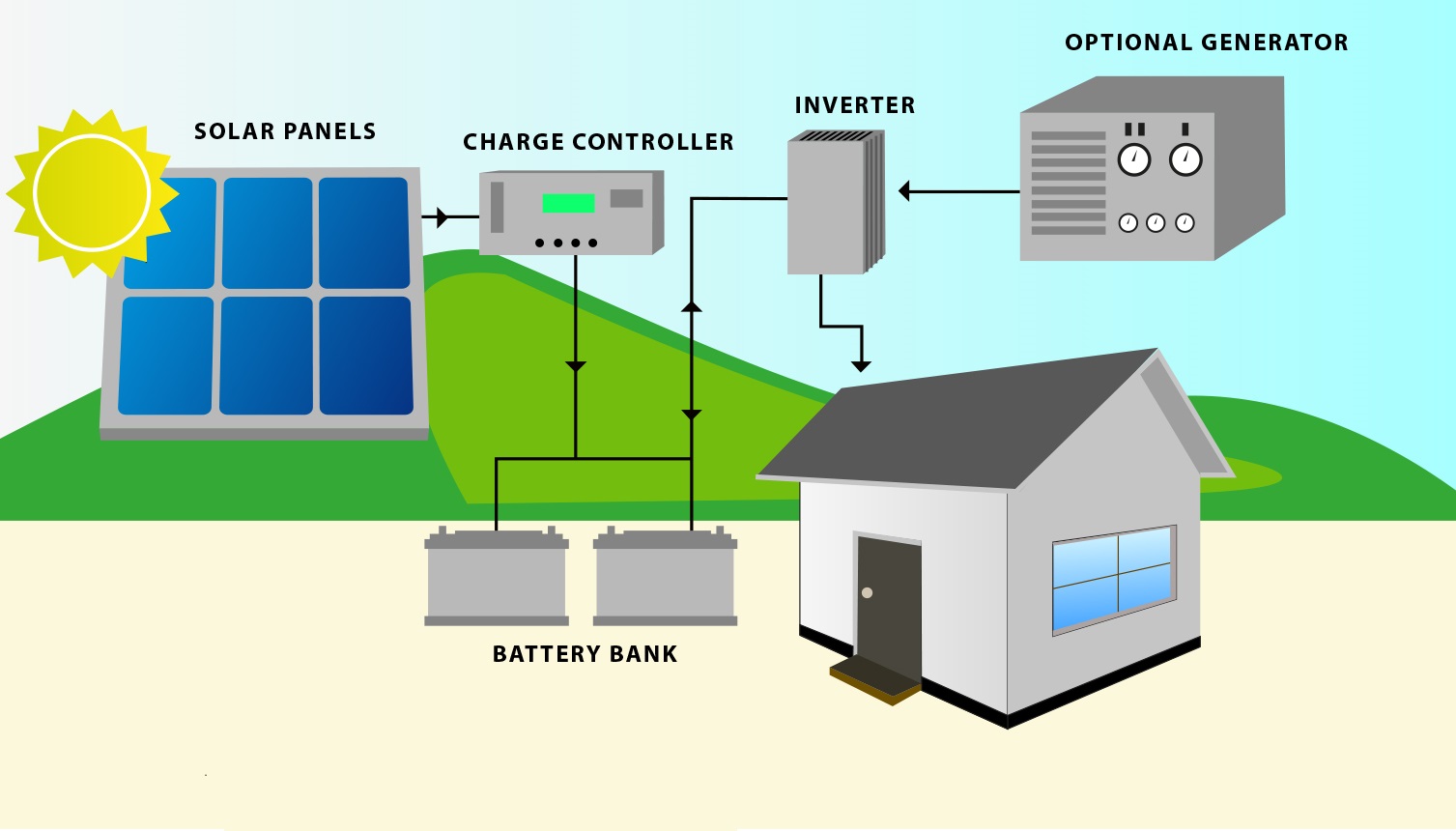 Off Grid can be stand alone power system or mini grids typically to provide smaller community electricity. Off Grid solar power stores DC Electricity in batteries